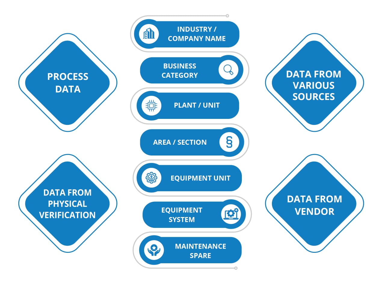 It includes collection, cleansing and standardization of Equipment tags, Its specifications, Category, Superior equipment, Position, Maintenance plant, planning plant, Profit center, Cost center etc.