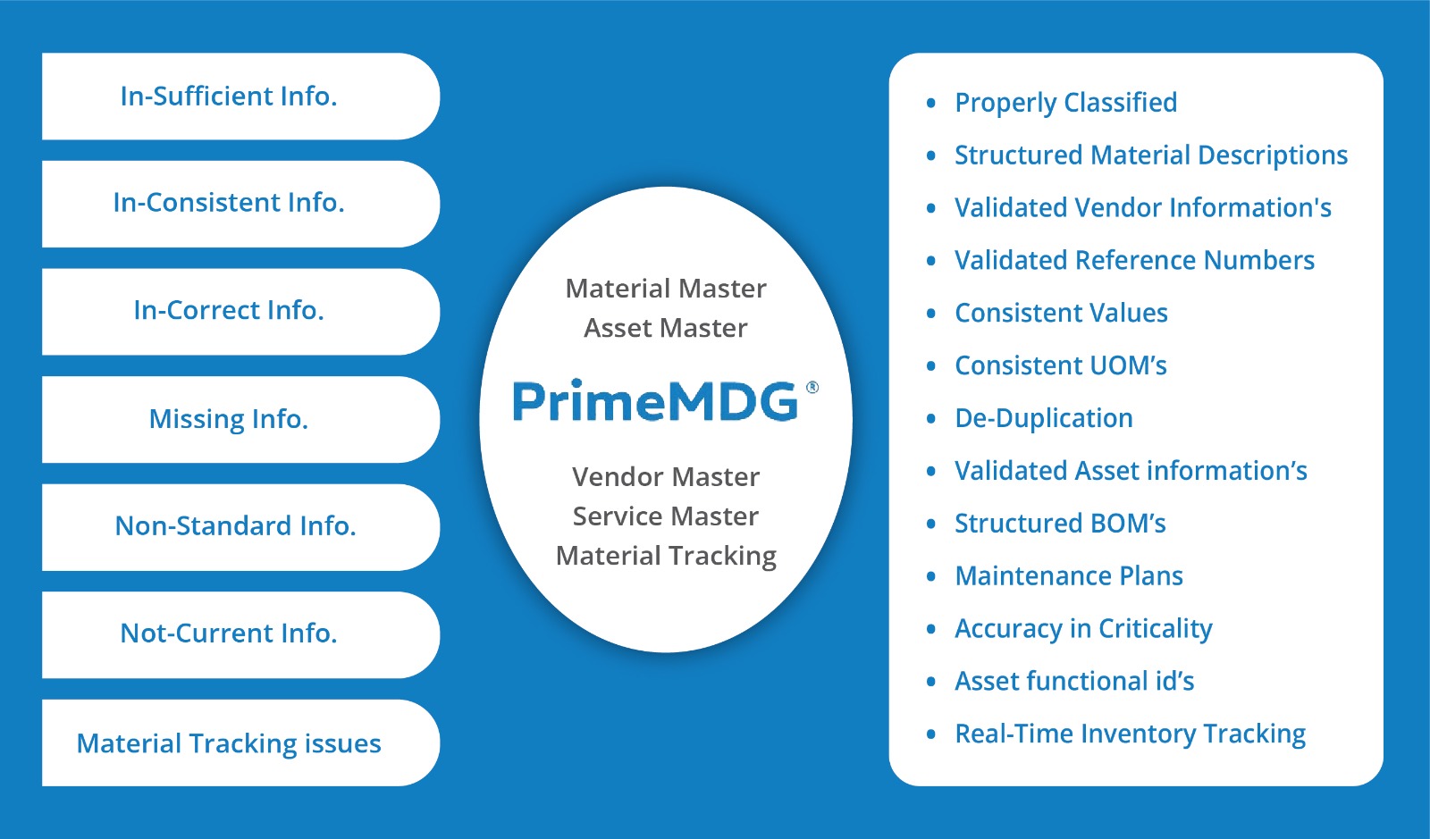 PrimeMDG® Solves the customer problems such as In-accurate Reporting due to Material Masters Constraints, Lack of Classification Standards, Non-Standard Material description creation, Duplications, Inaccurate Spend Analysis, Inaccurate MRP Level, Inefficacies in Spare Parts optimization, Part search fails, Unidentifiable Items, Material tracking issues etc.